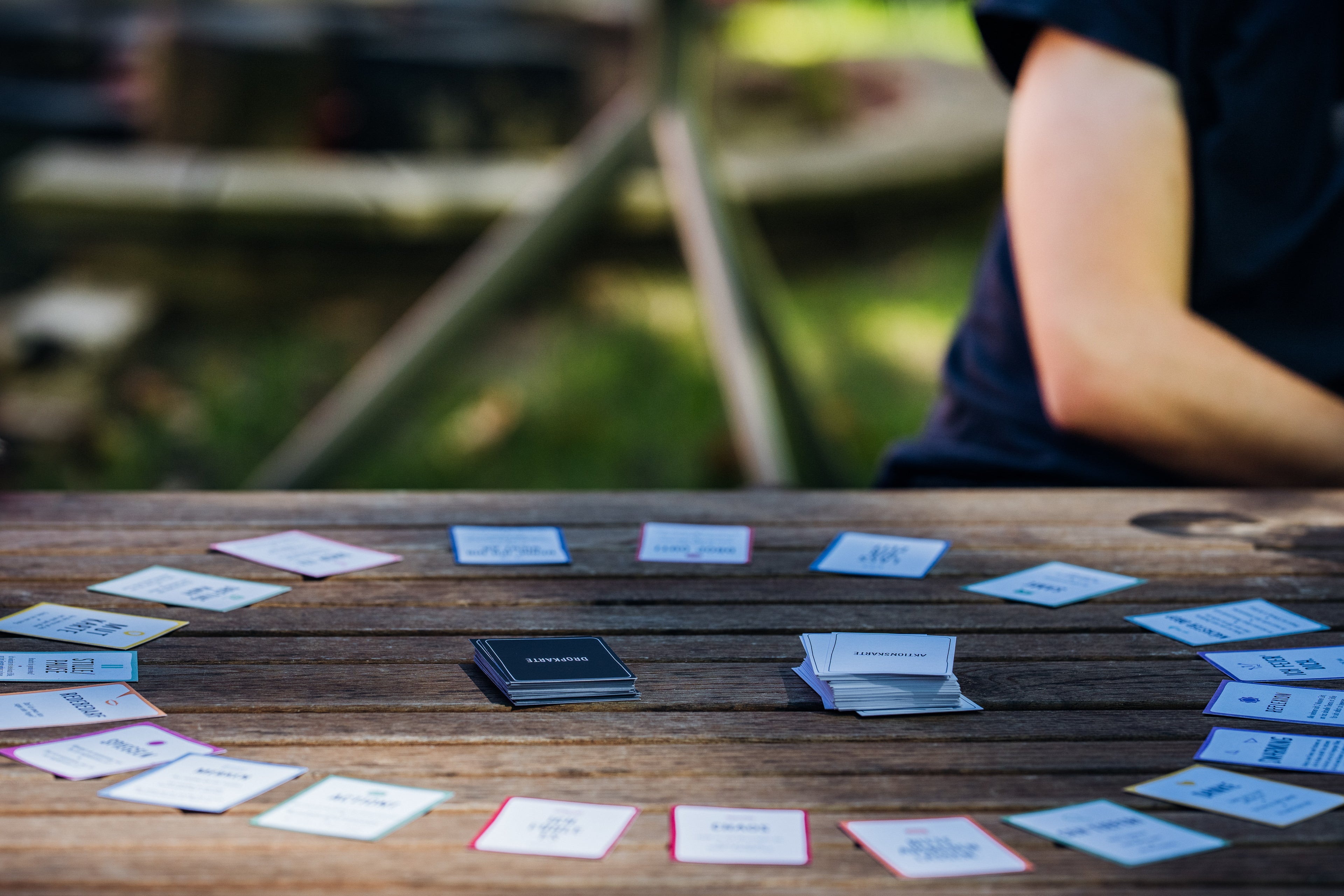 Die bunten Moderationskarten werden offen im Kreis ausgelegt. Die Aktions- und Dropkarten liegen als je ein verdeckter Stapel in der Mitte des Kreises.